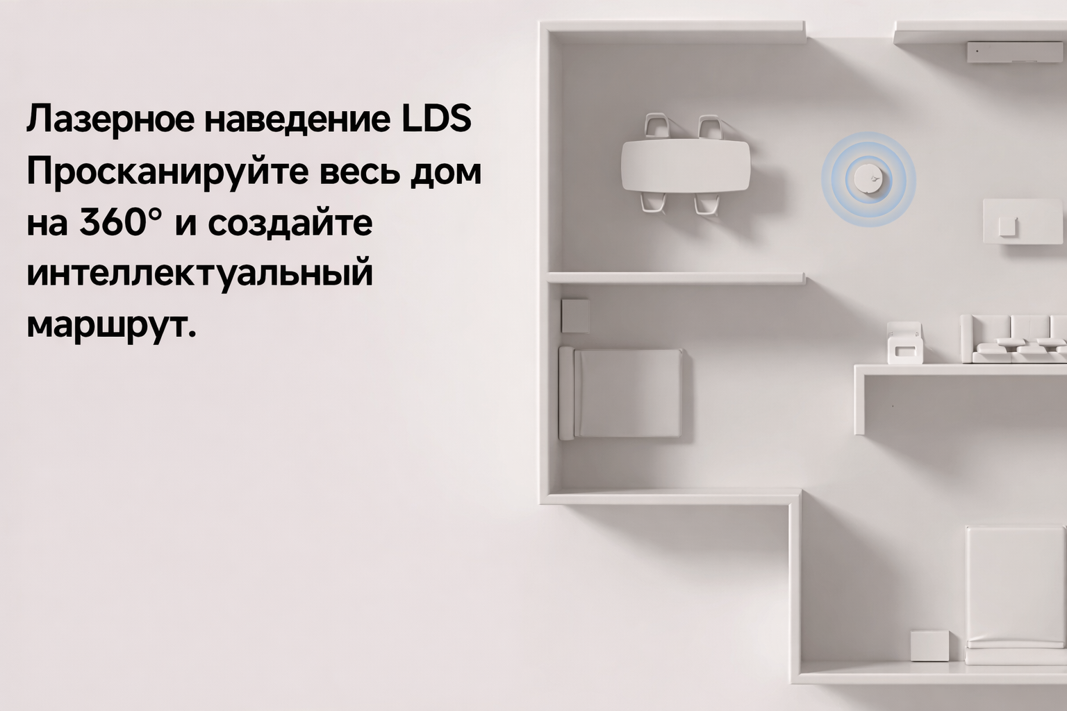 Система LDS точно строит карту помещения и выстраивает оптимальный маршрут движения, избегая препятствий и пропусков.